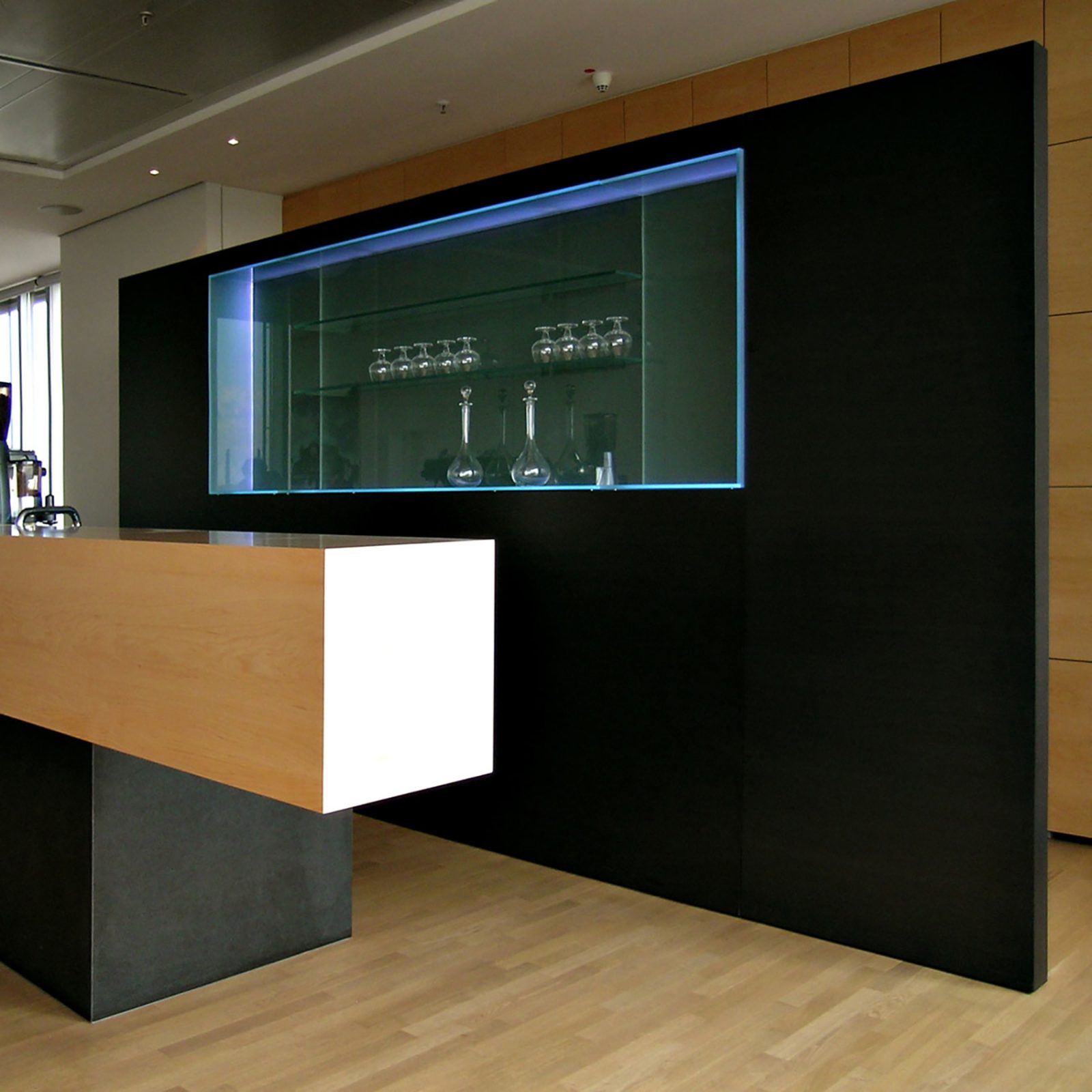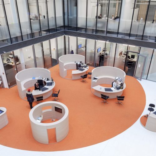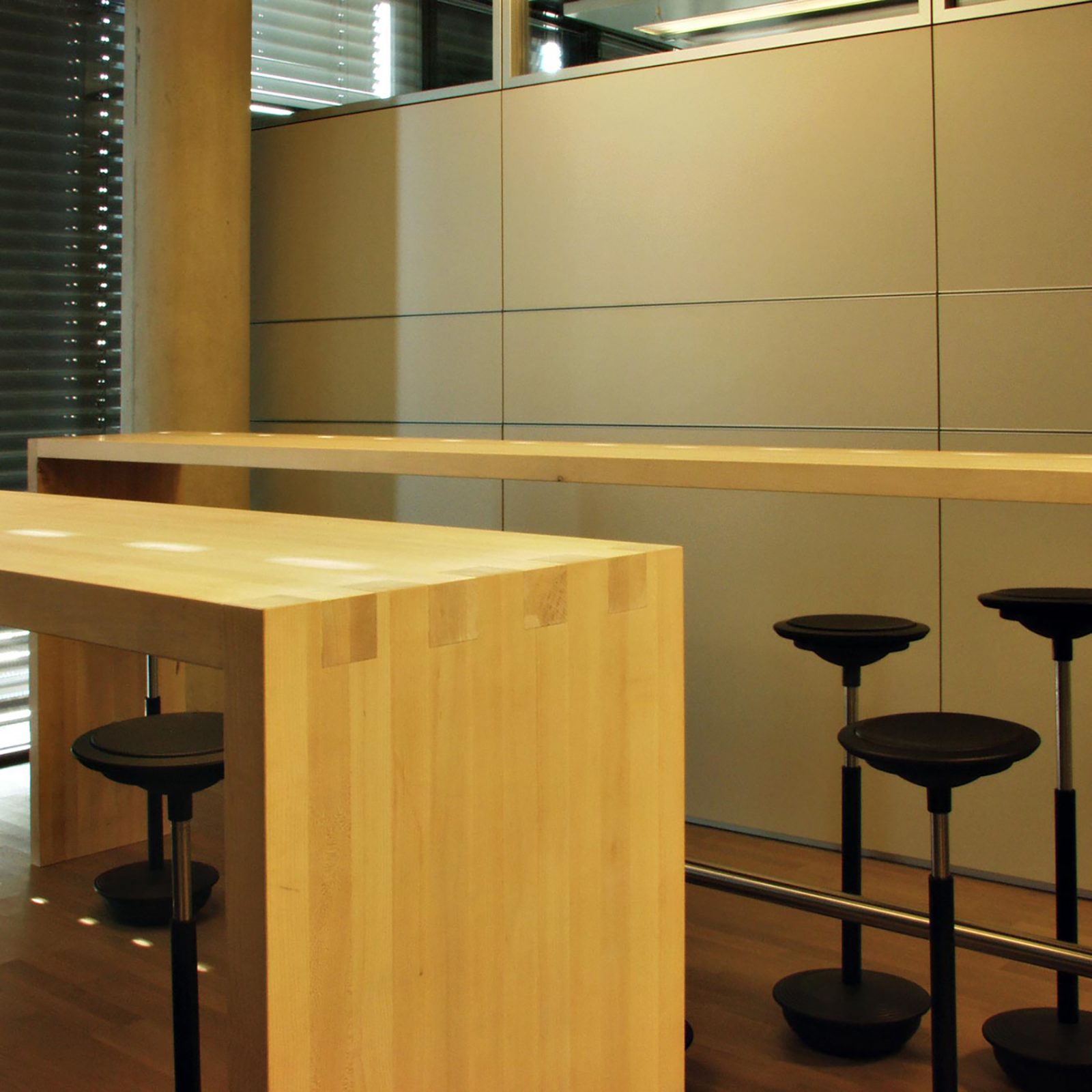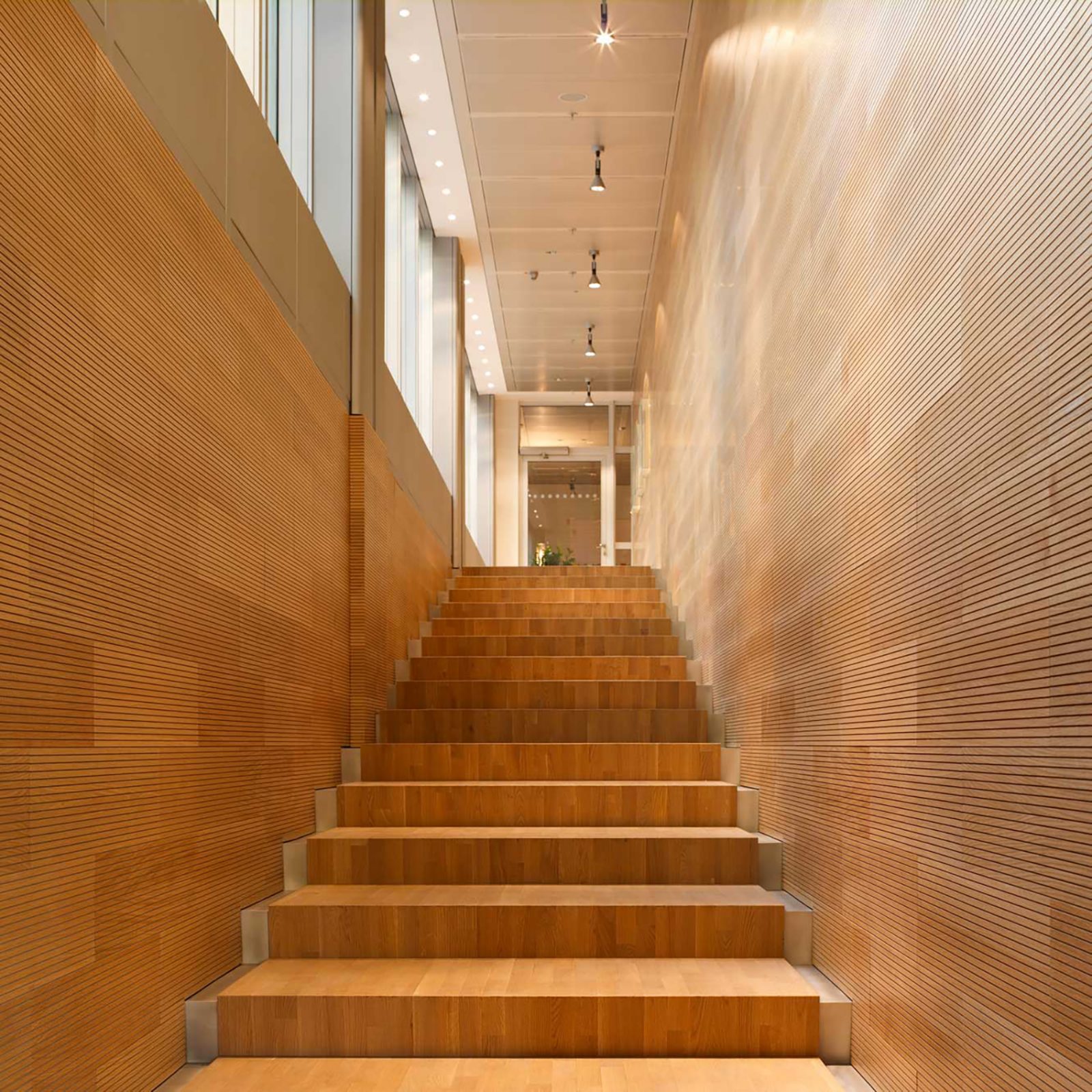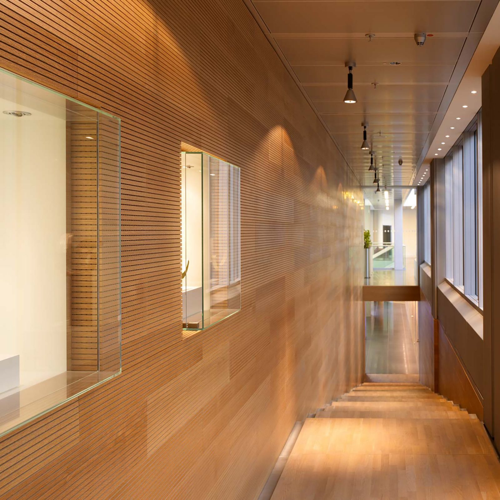 LEGNO liefert sämtliche Thekenanlagen im Gebäude. Hierzu gehören die runden Thekenanlagen im Erdgeschoss und die Empfangstheken auf den Etagen. Die mobilen Beratertheken sind im Inneren mit akustisch wirksamen Paneelen ausgestattet. Weiterhin werden Vorstandssekretariat, Schränke, Wandverkleidungen und Cafebars in hoher Innenausbauqualität errichtet. Die weißen Automateneinhausungen im Erdgeschoss werden aus leuchtenden Mineralwerkstoff gefertigt.
