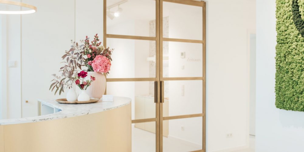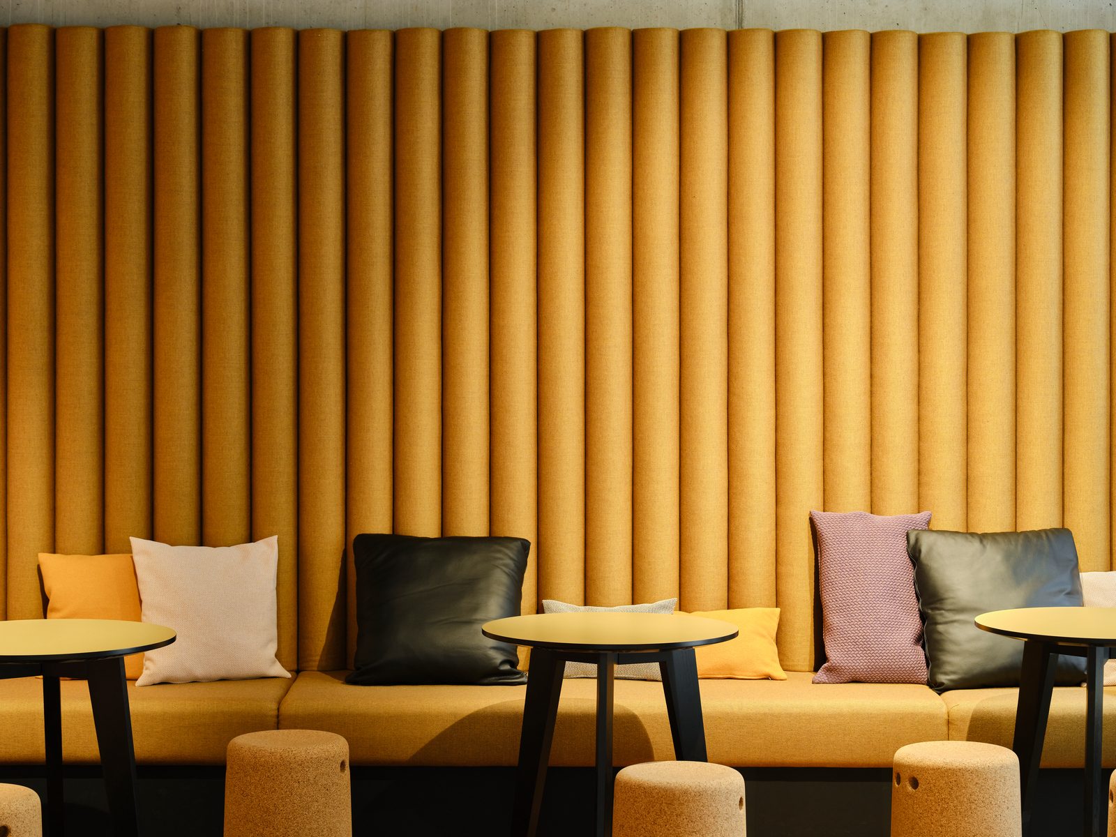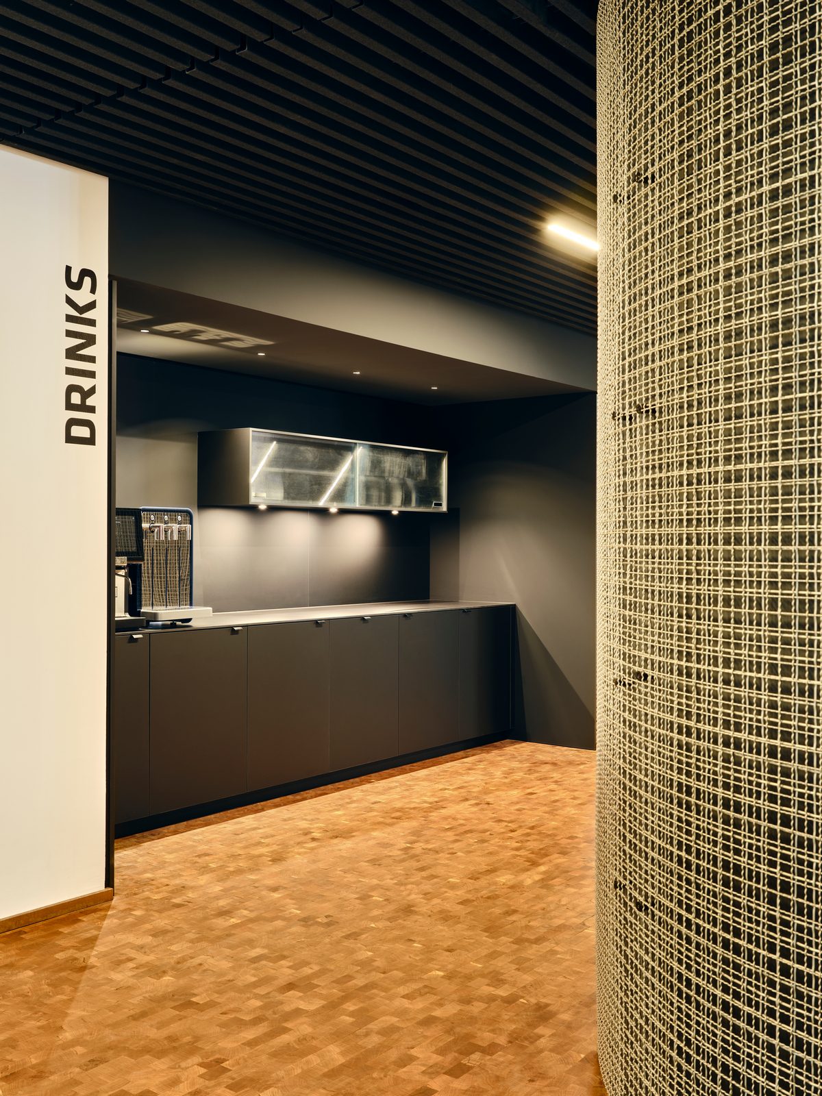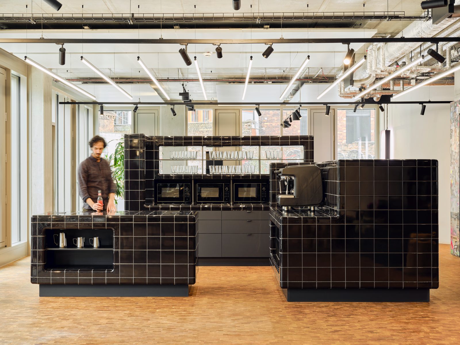 Die dunkle Kühle einer gefliesten Barista Bar trifft auf die warme Haptik der großzügigen Loungebereiche. Hölzerne Spielfiguren für Kinder kontrastieren den cleanen Look einer aufwendig gegossenen Empfangstheke aus Beton und filigran gegliederte Teeküchen werden mit konstruktiv anmutenden Metallelementen kombiniert.