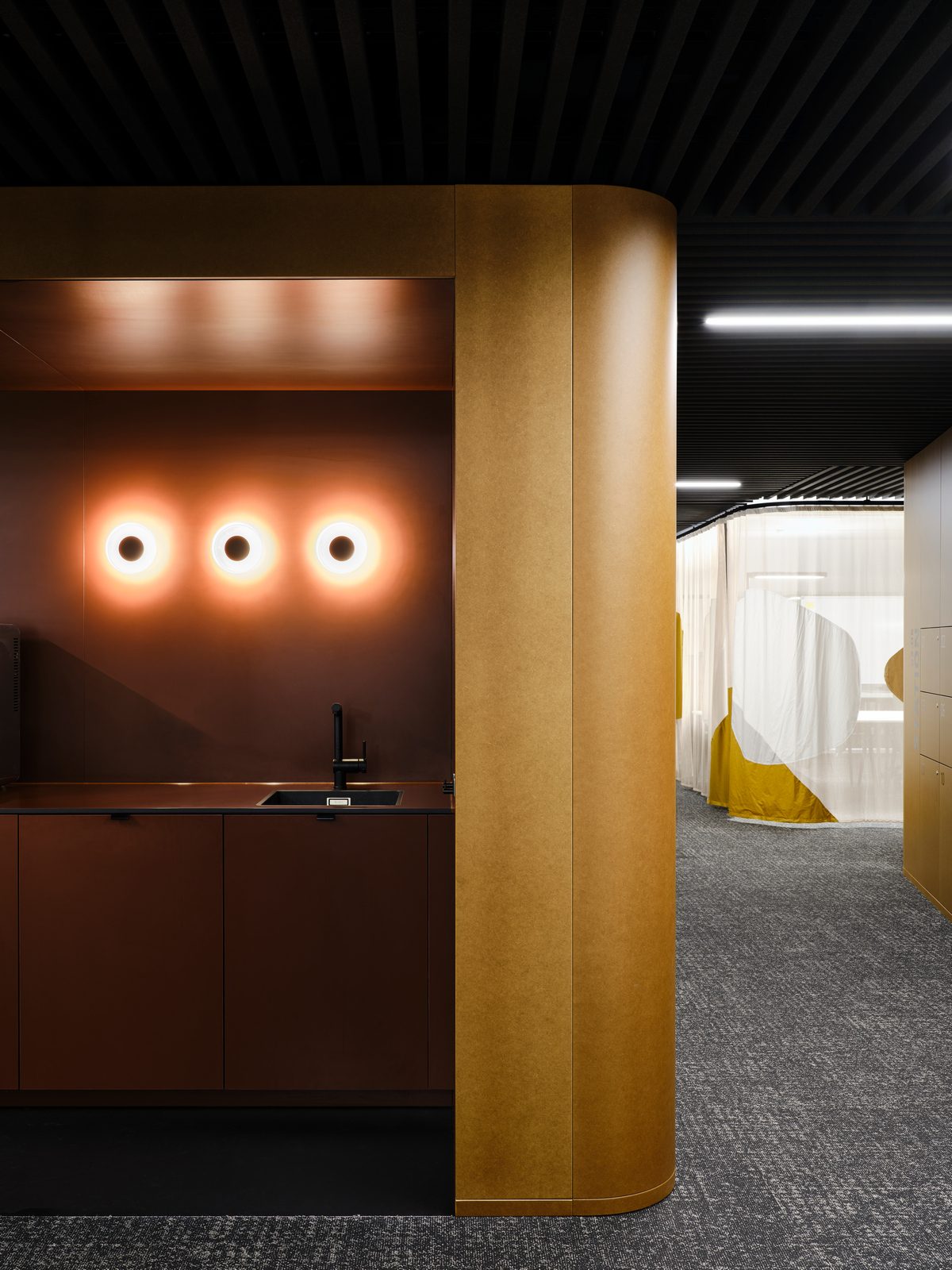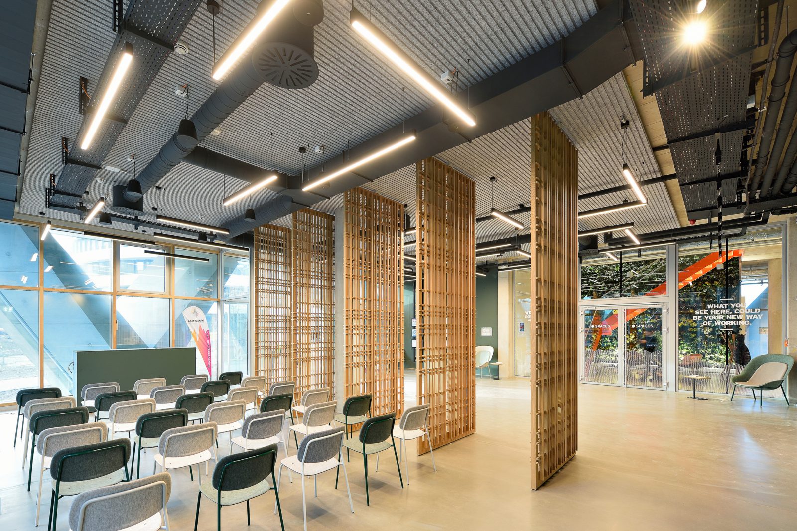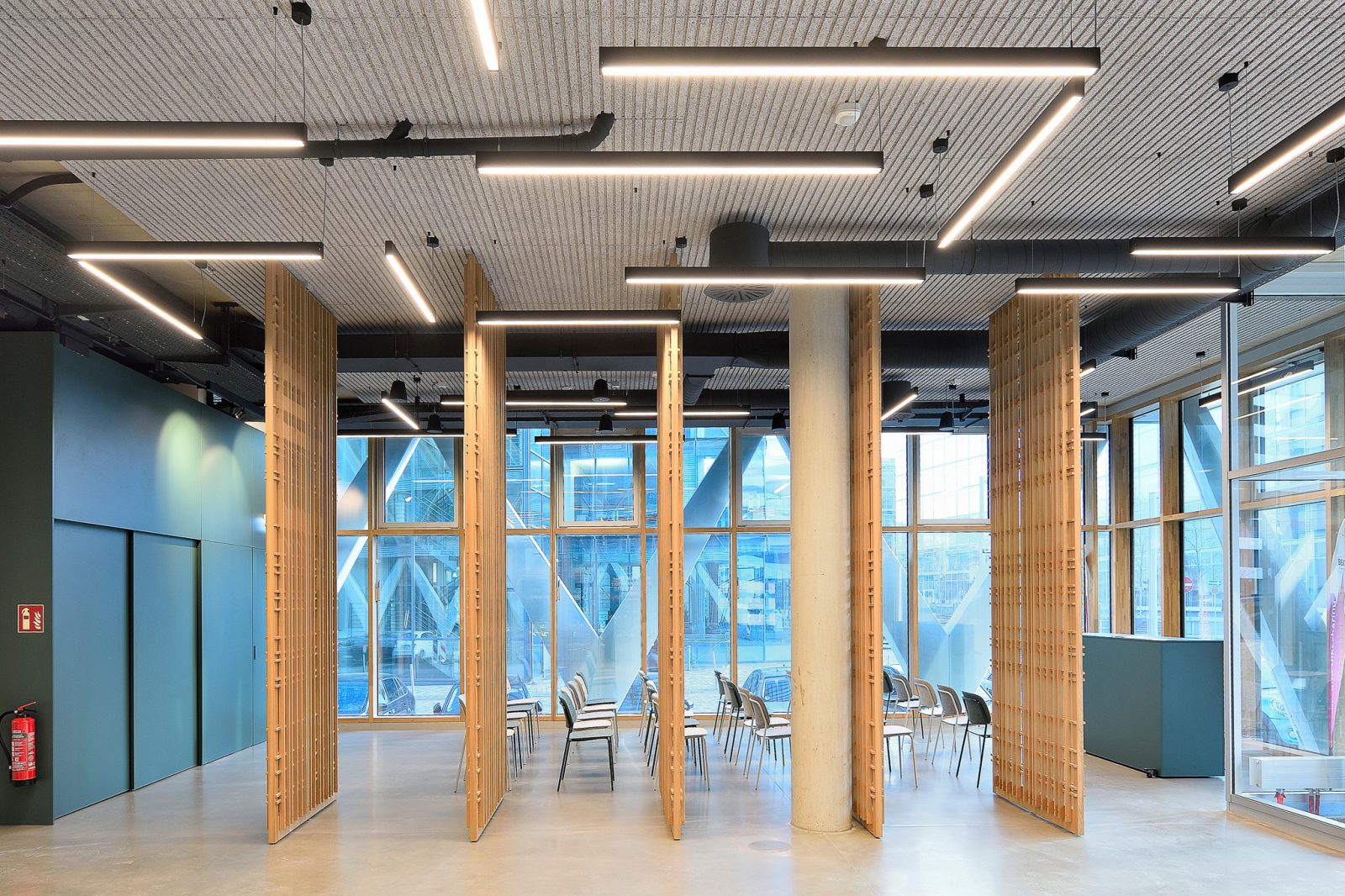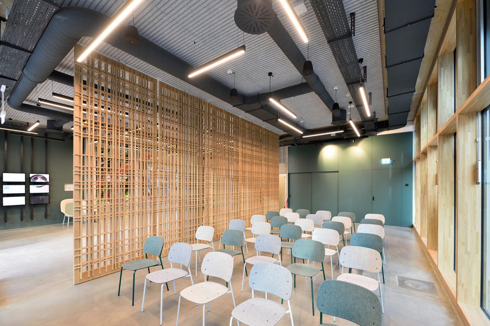 Die dunkle Kühle einer gefliesten Barista Bar trifft auf die warme Haptik der großzügigen Loungebereiche. Hölzerne Spielfiguren für Kinder kontrastieren den cleanen Look einer aufwendig gegossenen Empfangstheke aus Beton und filigran gegliederte Teeküchen werden mit konstruktiv anmutenden Metallelementen kombiniert.