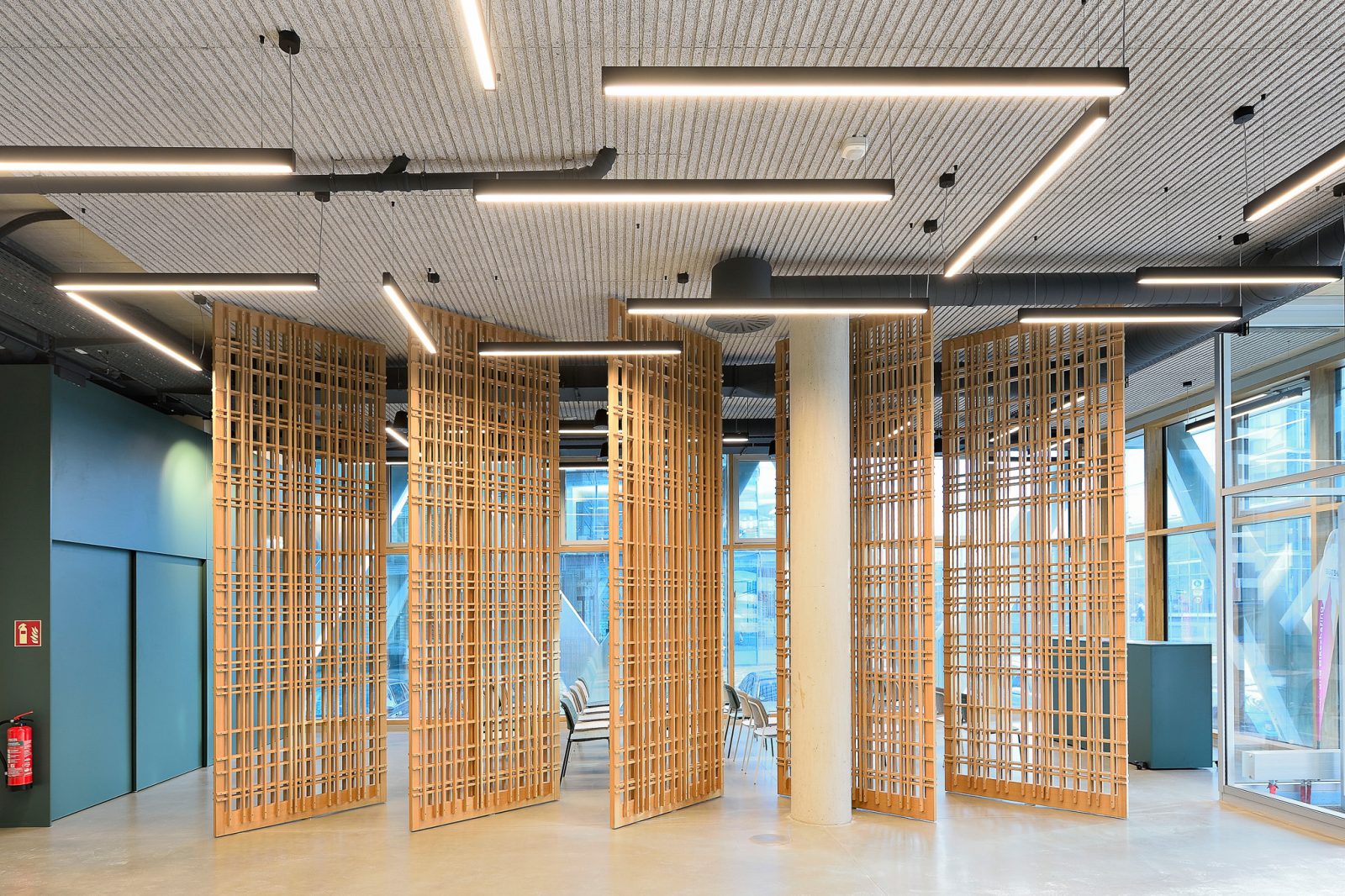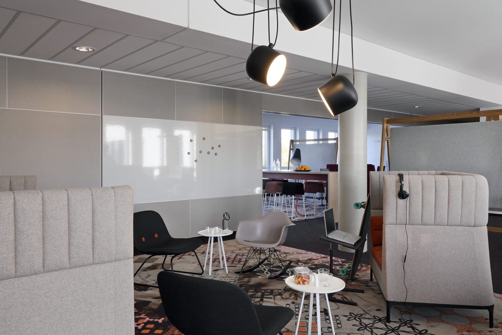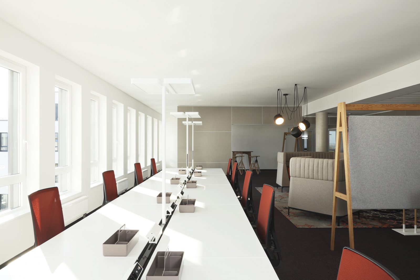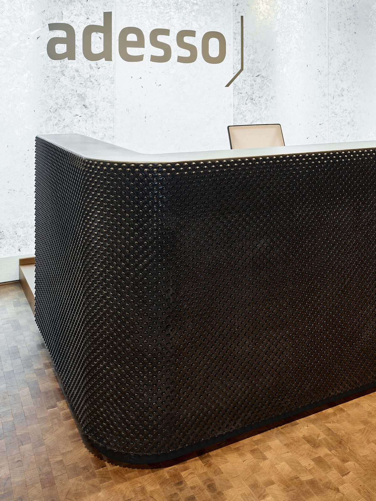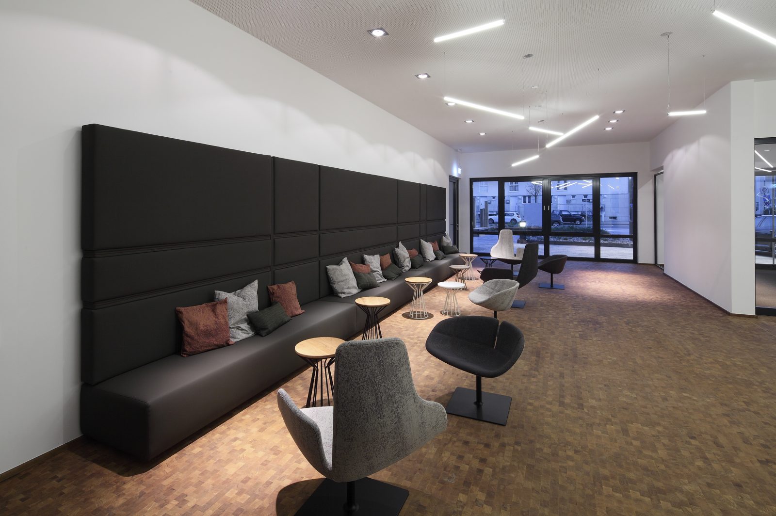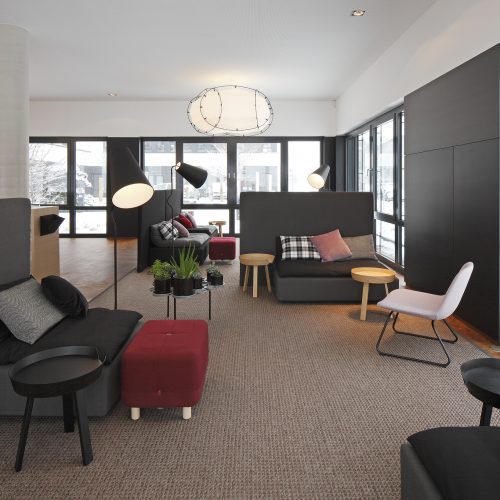 Die Düsseldorfer Raumkontor Innenarchitekten entwickeln ein einzigartiges Bürokonzept das den Anforderungen von adesso gerecht wird. Die Grenzen zwischen Großraumbüro und gemütlichem Wohnzimmer verschwinden. Büros, Konferenzräume, Bibliothek, Küchen, Bistro und Empfang werden von LEGNO in hoher Innenausbauqualität ausgestattet. Besondere gestalterische Bedeutung haben die individuell hergestellten Akustiktrennwände, die im gesamten Haus zu finden sind.