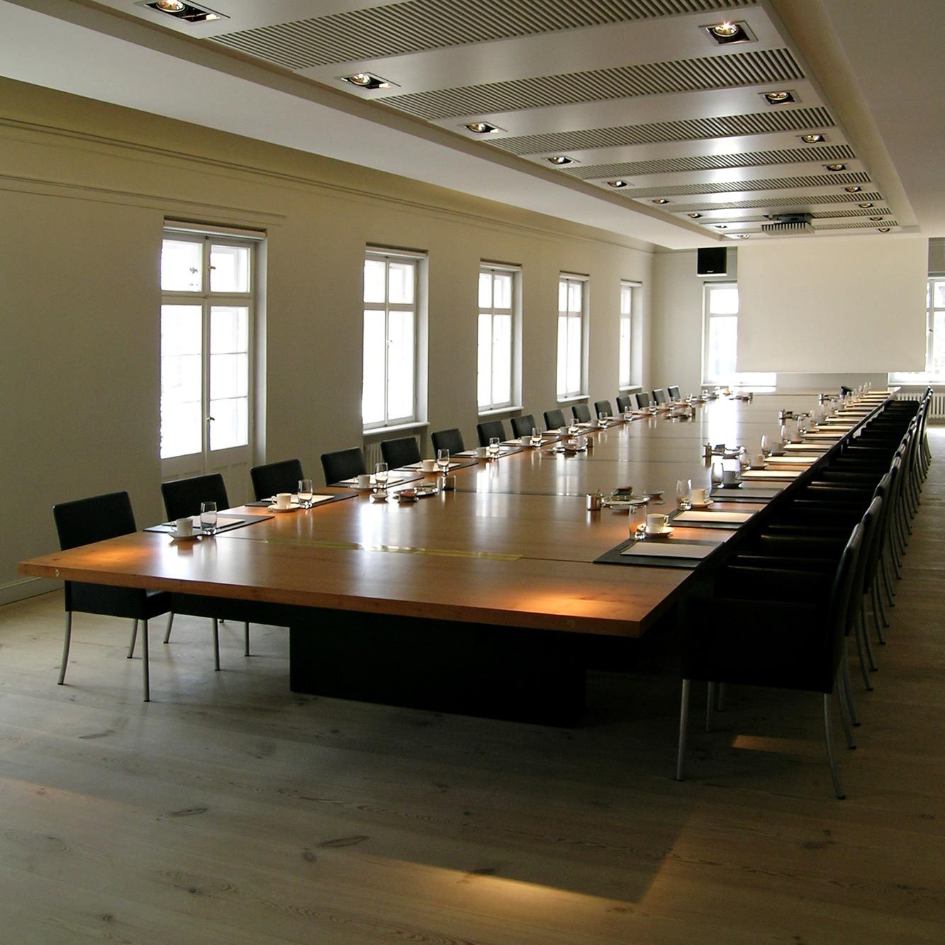 LEGNO realisiert einen individuellen Konferenztisch für den Sparkassen Giroverband im Schloss Neuhardenberg bei Berlin. Die hochwertige Tischplatte ist aus Eibe Furnier gefertigt und umfasst eine Länge von 15 Metern. Medientechnik wird geschickt integriert. Oberhalb des Tisches wird eine Akustikdecke mit Beleuchtung und ausfahrbarem Beamer installiert.