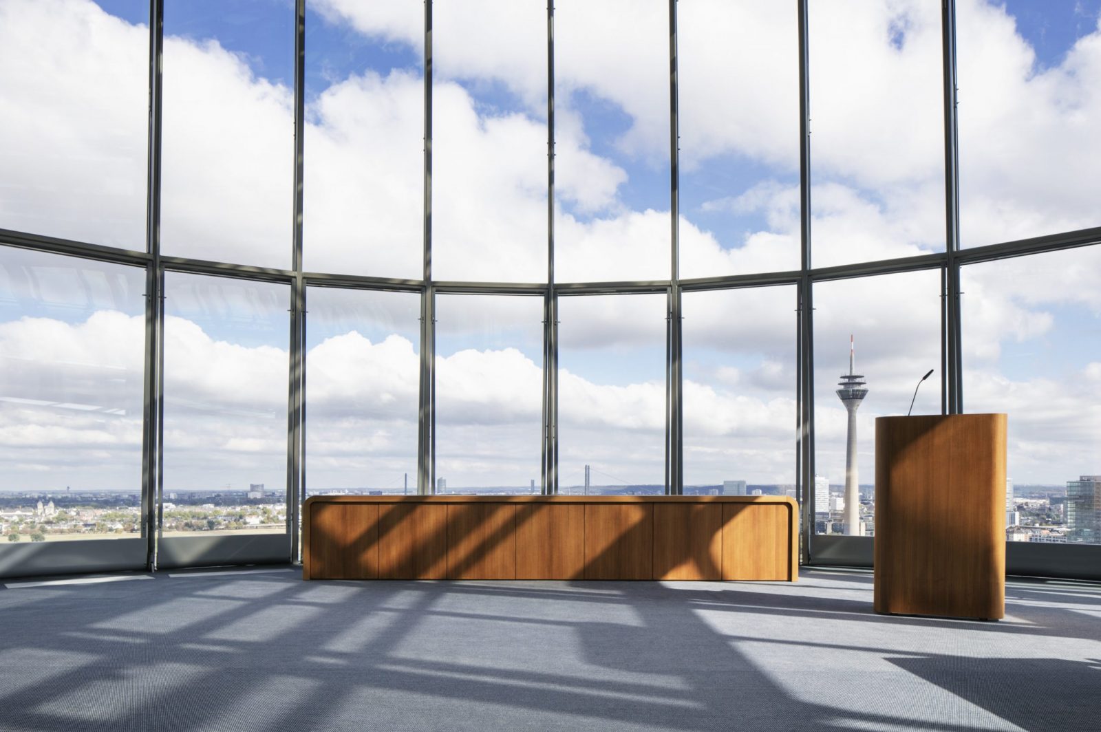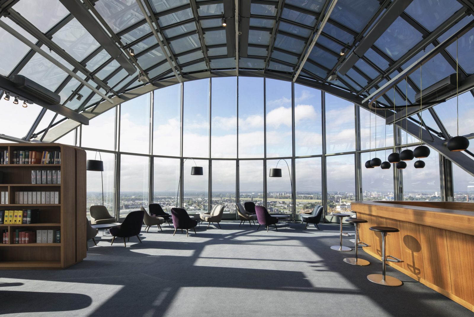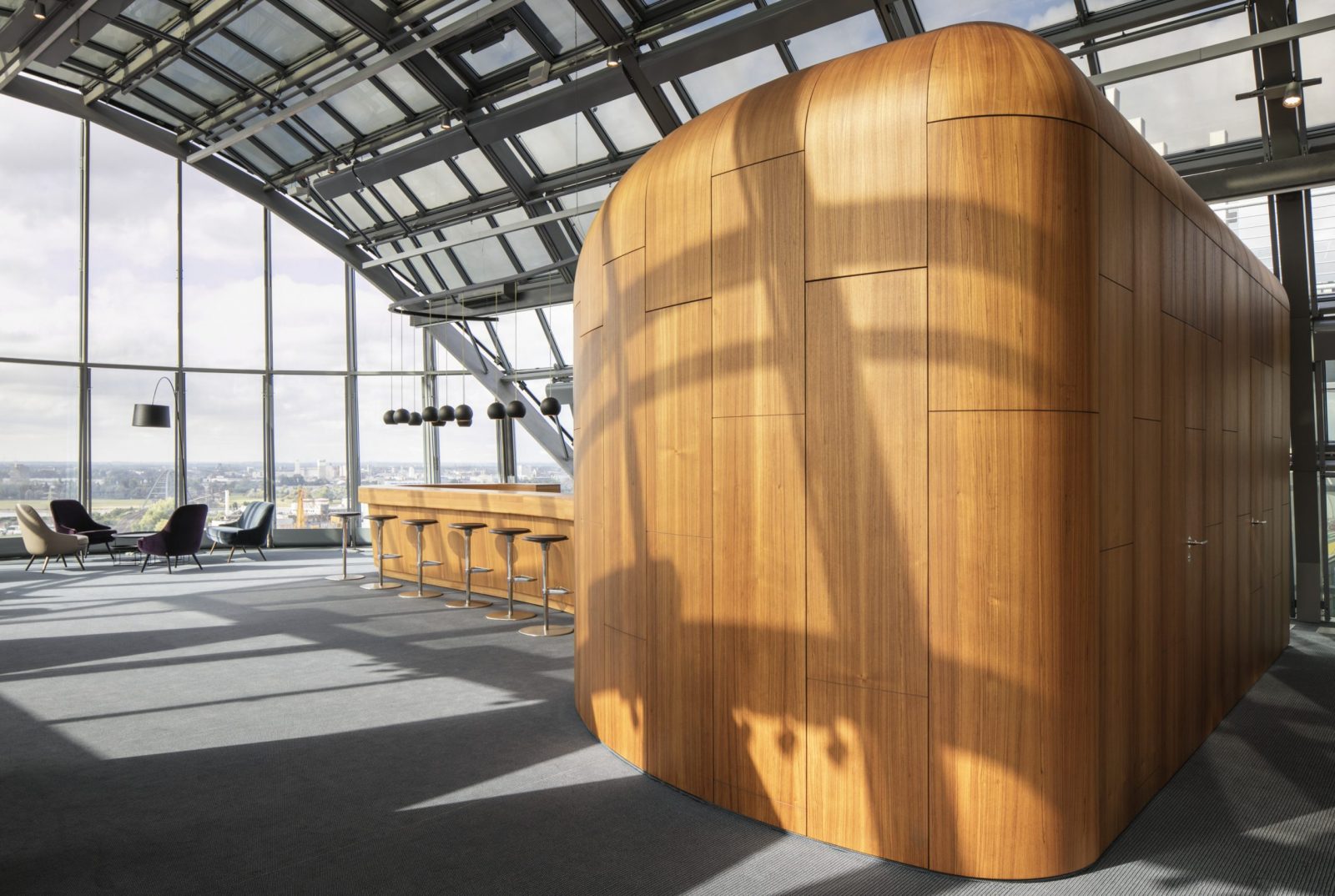 Die Anwaltskanzlei in einem Bürotower im Düsseldorfer Medienhafen erhält ein neues Interieur. LEGNO richtet die 12. bis 19. Etage nach Entwürfen der Kölner MSM Architekten individuell und hochwertig ein. Besonders exklusiv ist die Einrichtung der Kuppeletage im obersten Geschoss mit Blick über ganz Düsseldorf. Zum Auftrag gehört ein breites und komplexes Tätigkeitsspektrum: Sondertüren, Schallschutztüren, Konferenzräume, Wandverkleidungen, Küchen, Theken, WC-Anlagen, Waschtische, Schränke, Sideboards, Sitzbänke, Glastrennwände und die Bibliothek werden von Legno konstruiert und hergestellt. Das besondere Highlight ist die geschwungene, 3D verformte und furnierte Bar im obersten Stockwerk. Das Thekenbrett ist aus Massivholz gefertigt. LEGNO erfüllt die anspruchsvollen Anforderungen des Kundens in den Bereichen Design, Funktion, Qualität, Brand- und Schallschutz.