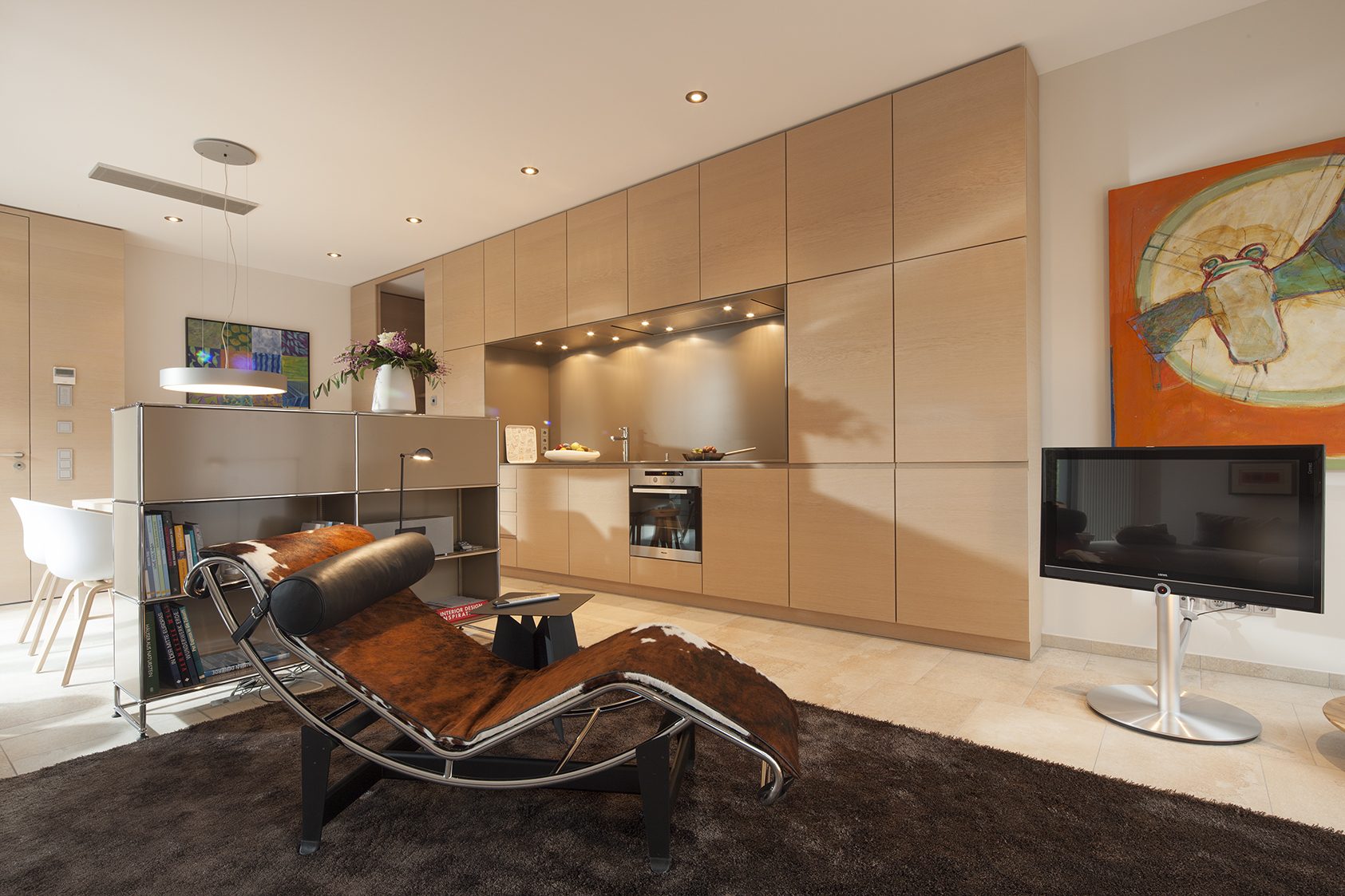 Für ein Ferienhaus auf Noderney baut LEGNO eine individuell hergestellte Küchenzeile aus hell gebeiztem Eichenfurnier. Die Kochnische ist in einer grauen HPL Einhausung ausgeführt. Die gefrästen Griffschienen geben der Küche ein schlichtes Design. Im gleichen Stil sind Sideboards, Esstisch und Türen hergestellt.