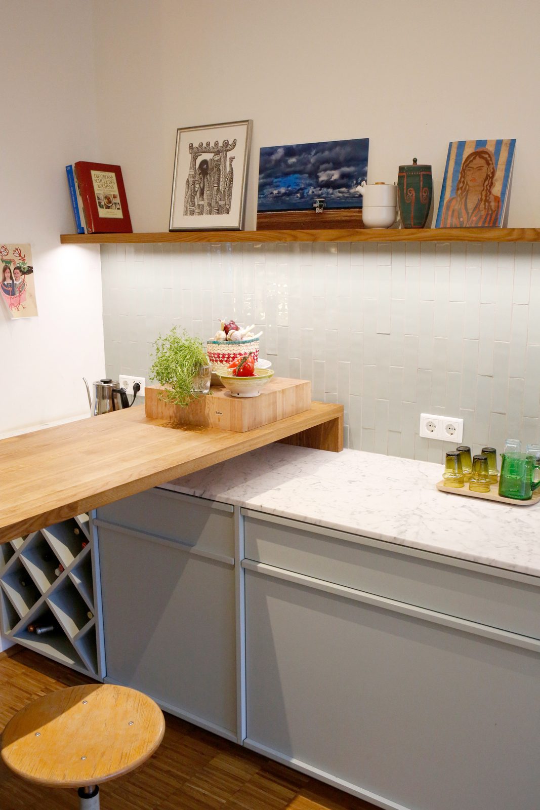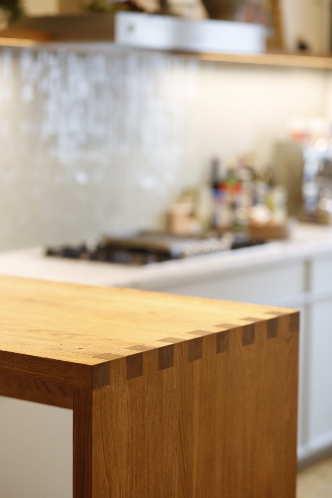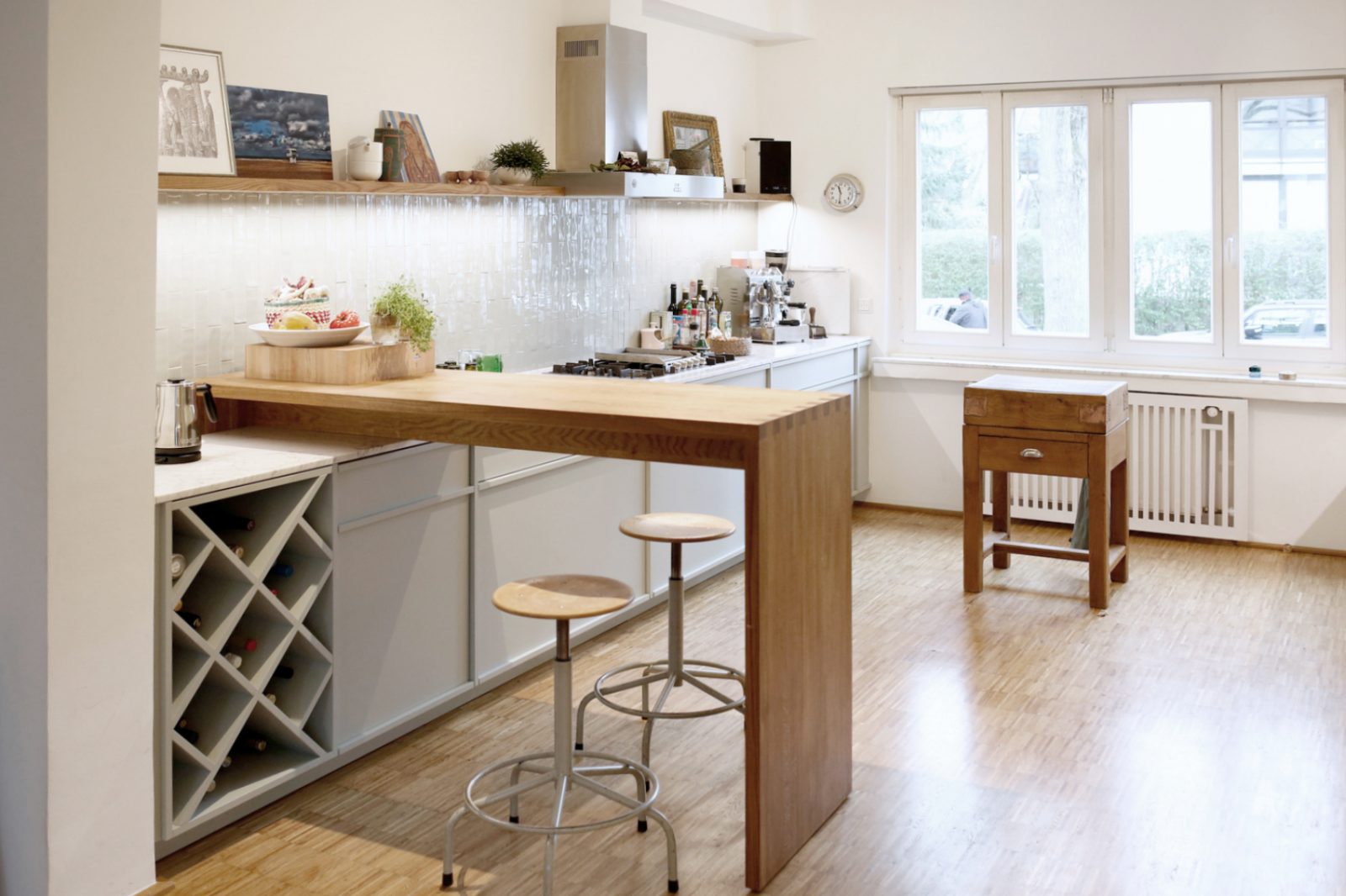 Bei dieser privaten Küche wird das gesetzte Form- und Farbkonzept von einem Tresen aus massiver Eiche durchbrochen. Die sichtbare Zinkenverbindung der Theke zitiert unsere handwerklichen Wurzeln. Wir freuen uns über diesen gelungenen Ort, an dem aus Altem und Neuem ein Raum familiärer Begegnung wird. LEGNO hat diese Küche zusammen mit der Kundin entworfen und gebaut.