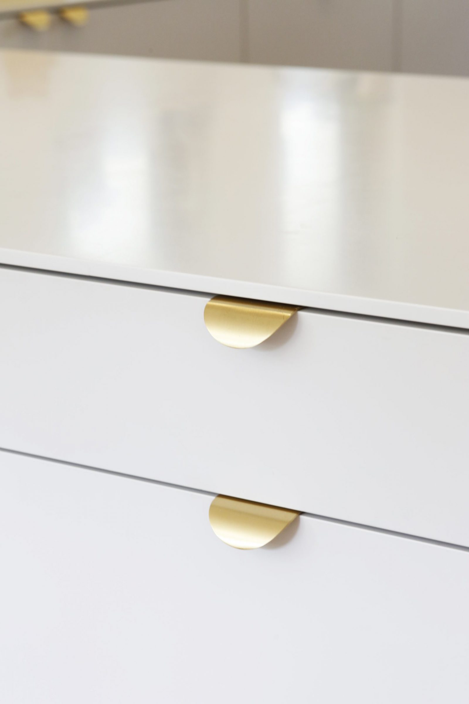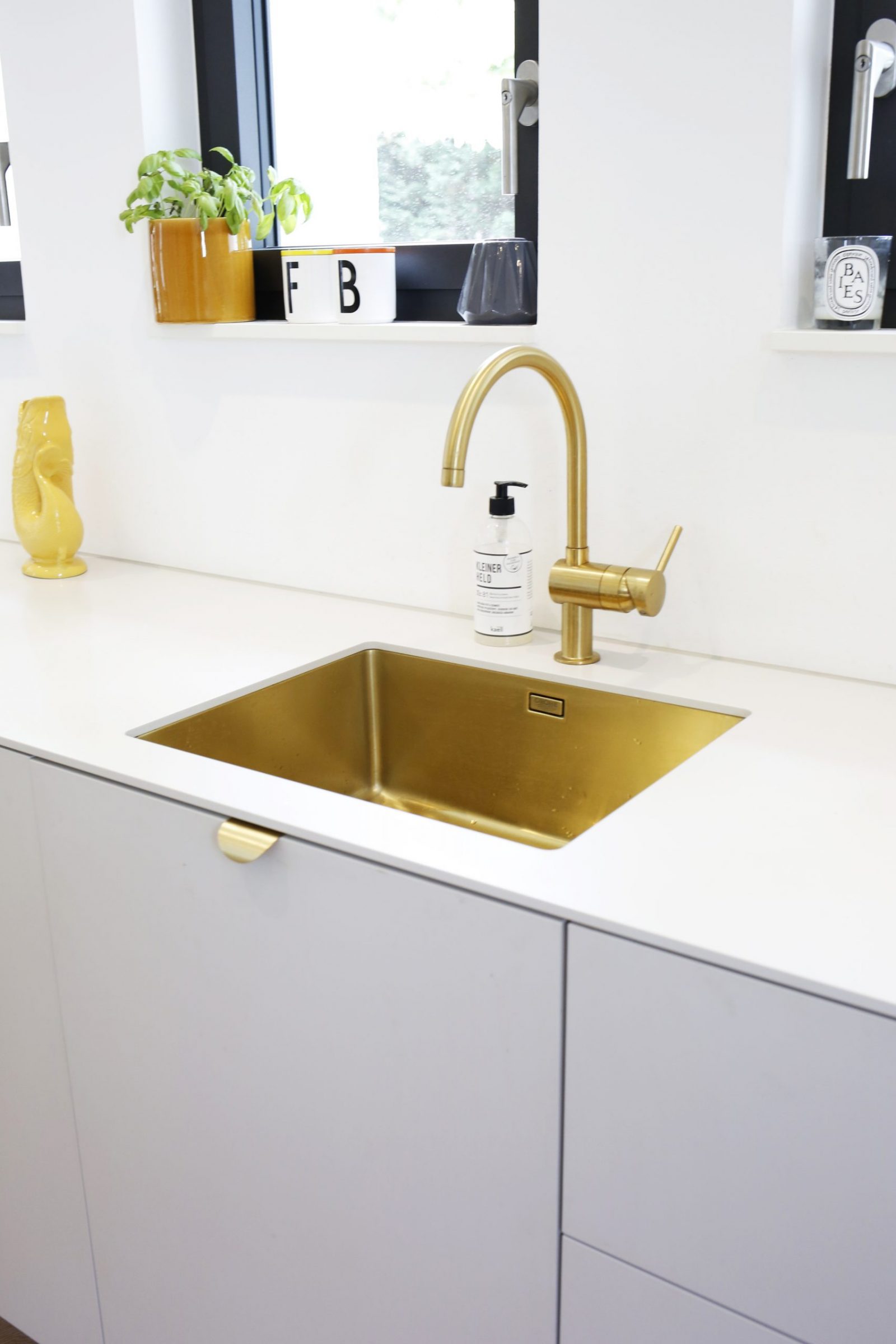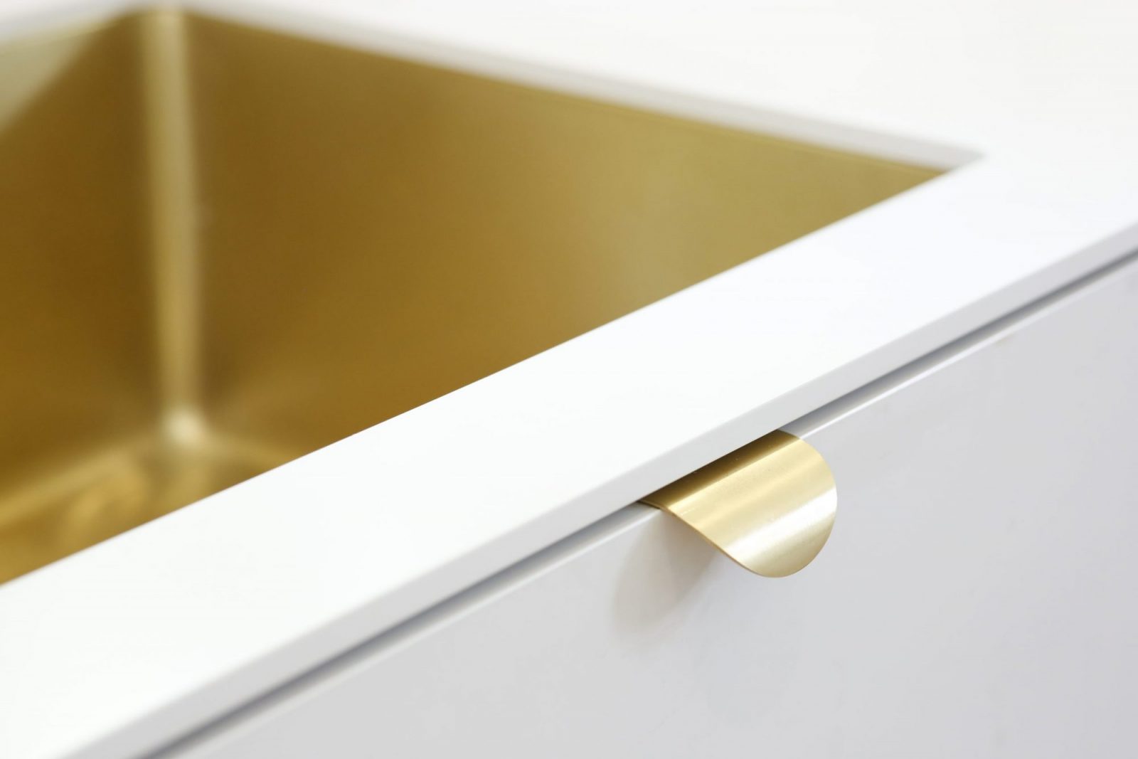 In enger Absprache mit dem Kunden entwirft und baut LEGNO eine moderne Küche die mit goldenen Aktzenten die schlichten Formen und Farben der Korpusse durchbricht.